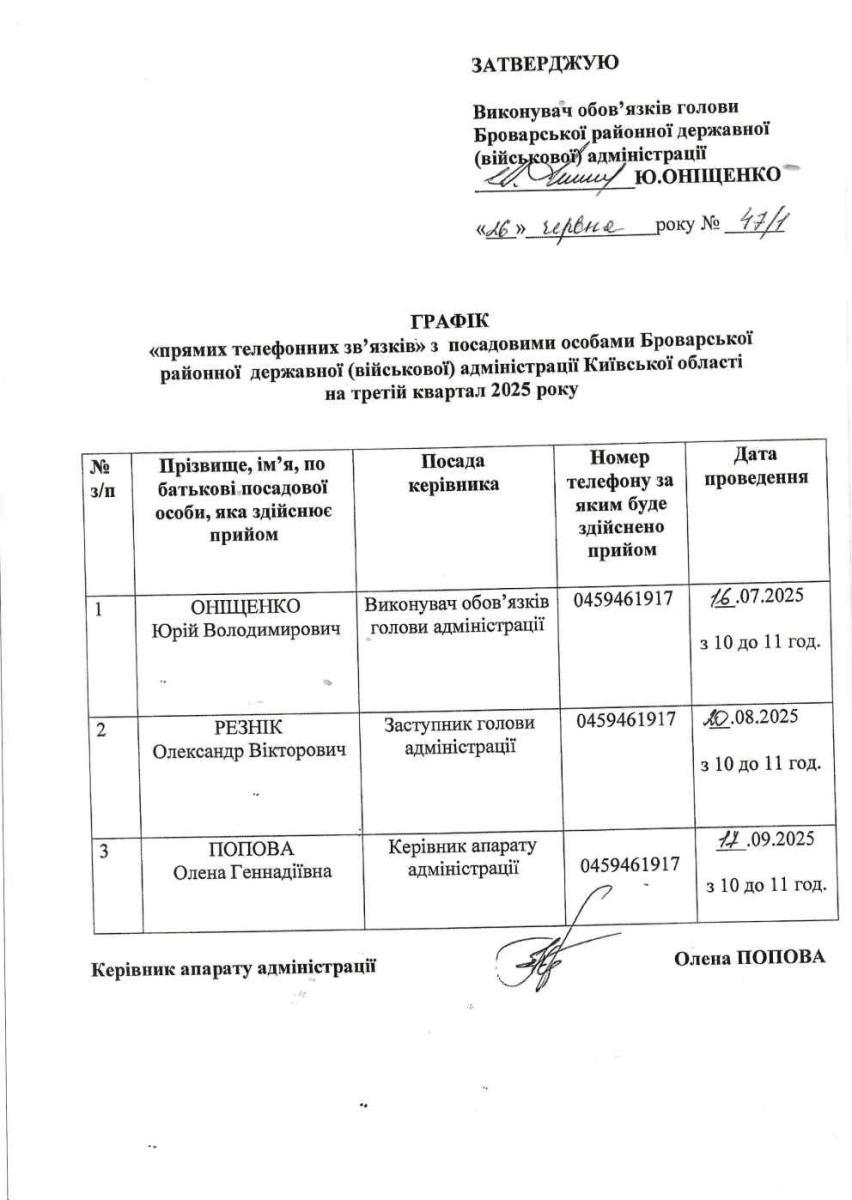 Графік "прямих телефонних зв'язків" з посадовими особами Броварської РДА