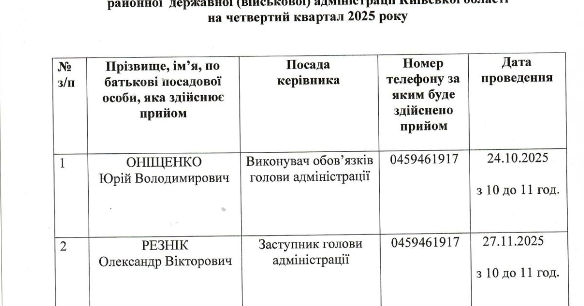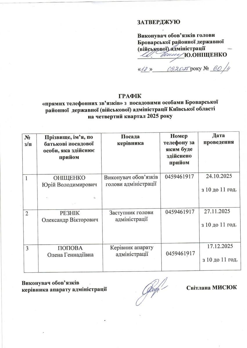 Графік "прямих телефонних зв'язків" з посадовими особами Броварської РДА на четвертий квартал 2025