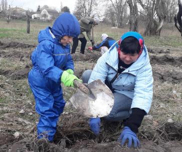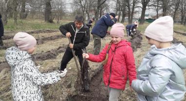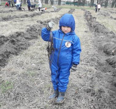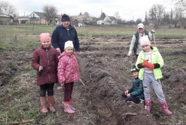 Пообідали, і знову за роботу. Валентина Нежива, керівниця «Променя», готувала дітям порцію за порцією саджанці, а ті вже разом з дорослими опускали їх в землю. Маленький Артем Ганжа, який тут працював разом із сестричкою та мамою Інною, самостійно відбирав саджанці, бо вже знає як.