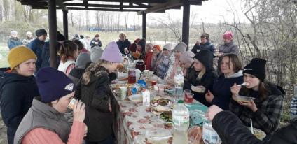 Один з татів, Сергій Ходос, своїм трактором з плугом зробив попередню підготовку. Поки активно дітки з дорослими взялися за саджання дубків, Григорій Падалка, а його онука, восьмирічна Ангеліна Грицаєнко вже років чотири активно ходить у «Промінь», розвів багаття і зварив чудесний куліш. Тут же господарювала й бабка Ангеліни Ніна Володимирівна. Всі разом вони приготували чудесний стіл. І смачнющий, бо хлопчики й дівчака активно і з бажанням поповнили витрачений запас енергії під час роботи.