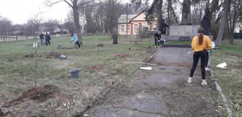 А у Бобрику цього дня саджали деревця не тільки в урочищі. І тут знову варто говорити про ініціативу знизу, від громади. У парку біля обеліска, в центрі села, працювала група молодих людей.