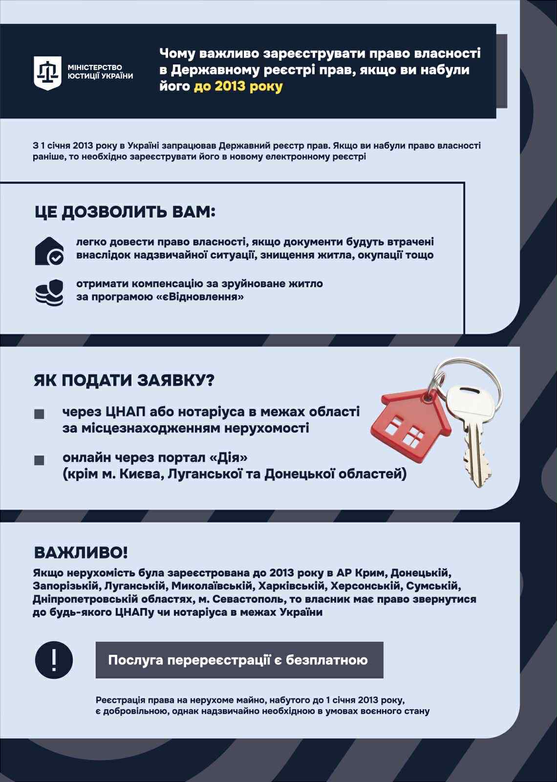 Таким чином, громадяни не мають обов’язку «перереєстрації» речових прав, що виникли до 01 січня 2013 року, однак це є необхідністю в умовах воєнного стану.