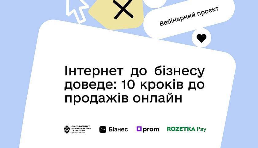 Державна установа «Офіс з розвитку підприємництва та експорту» та національний проєкт Дія.Бізнес спільно з маркетплейсом Prom.ua та платіжним сервісом RozetkaPay запрошують представників мікро, малого та середнього бізнесу, а також тих, хто тільки планує власну справу на безоплатний вебінарний проєкт «Інтернет до бізнесу доведе: 10 кроків до продажів онлайн», який допоможе детальніше дізнатися, з чого починати бізнес онлайн, що потрібно, щоб стати підприємцем, як працювати з асортиментом та як безпечна оплата впливає на конверсію замовлень.