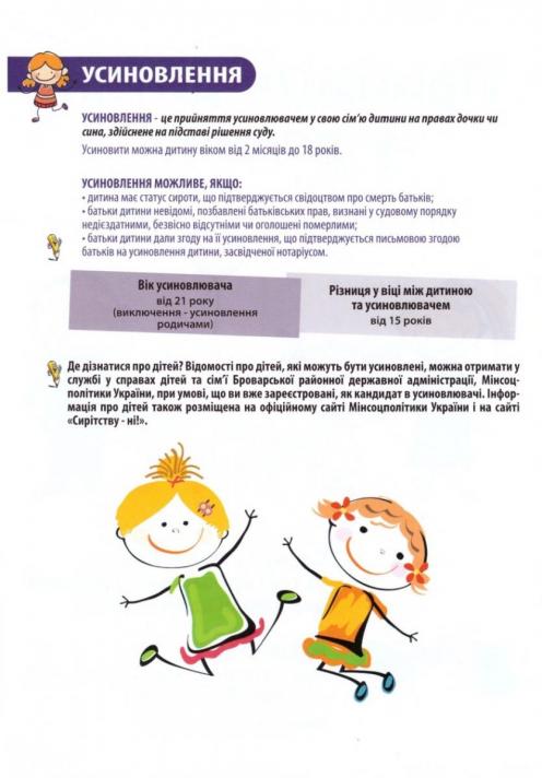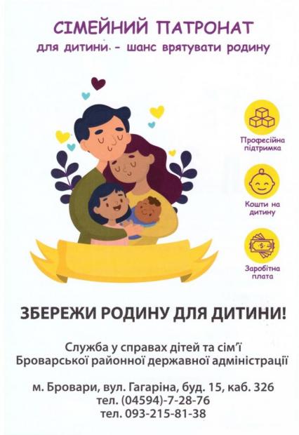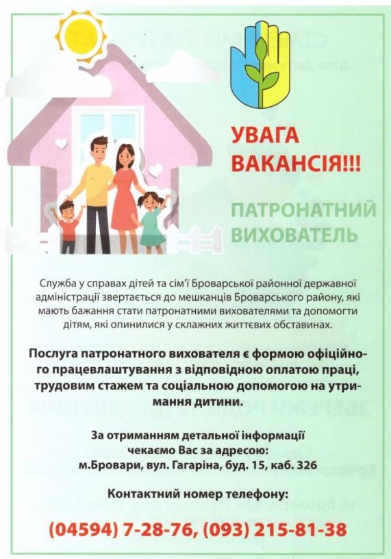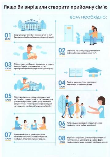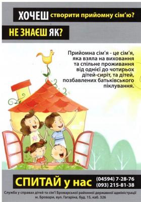 Служба у справах дітей та сім’ї Броварської районної державної адміністрації, в межах своїх повноважень, надає методичну допомогу та супровід у створенні прийомної сім’ї, патронатної сім’ї, створення дитячого будинку сімейного типу, усиновлення та інше, що стосується цієї сфери: