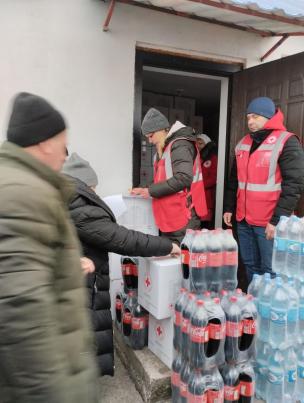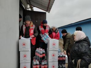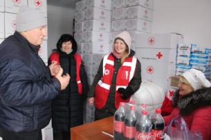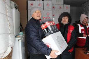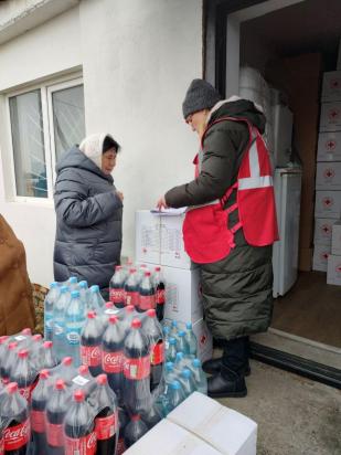 напої. Товариство Червоного Хреста України передає продуктові набори людям у регіони,