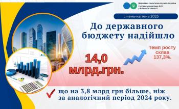 За підсумками січня–квітня 2025 року платники податків Київської області перерахували до державного бюджету 14,0 млрд грн, що на 3,8 млрд грн більше, ніж за аналогічний період 2024 року. Темп росту склав 137,3%, що свідчить про позитивну динаміку та ефективну роботу податкової служби регіону.