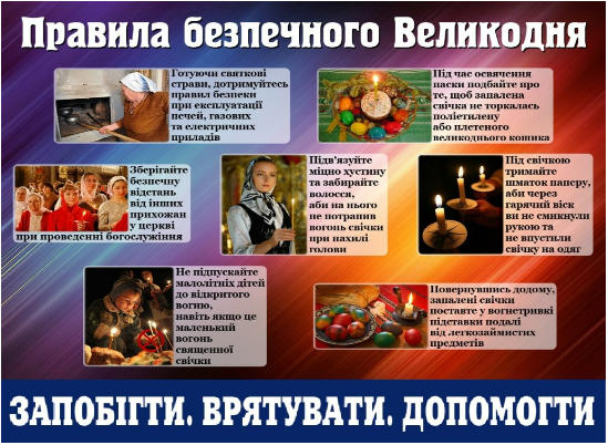 Вдома у ході приготування паски та різноманітних святкових страв слід обережно поводитися з електричними побутовими приладами та печами, аби не призвести до пожежі на кухні. Проявляйте особливу пильність та обережність при використанні свічок – тримаючи свічку в руках, слідкуйте за тим, щоб вогонь не потрапив на власні або чужі речі, які можуть миттєво спалахнути. Під час освячення паски, подбайте про те, аби запалена свічка не торкалась поліетилену або кошика. Прослідкуйте, щоб діти перебували під наглядом дорослих та не бавилися з вогнем.
