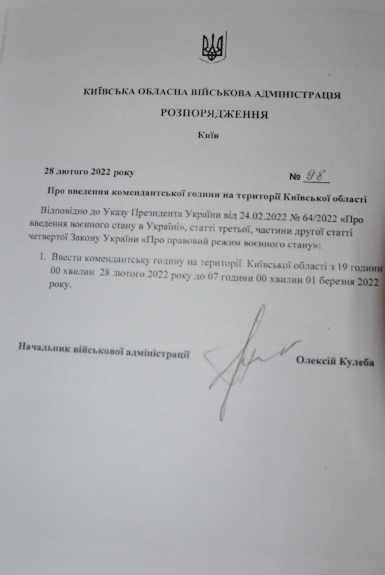 ...1. Ввести комендантську годину на території Київської області з 19 години 00 хвилин 28 лютого 2022 року до 07 години 00 хвилин 01 березня 2022 року.