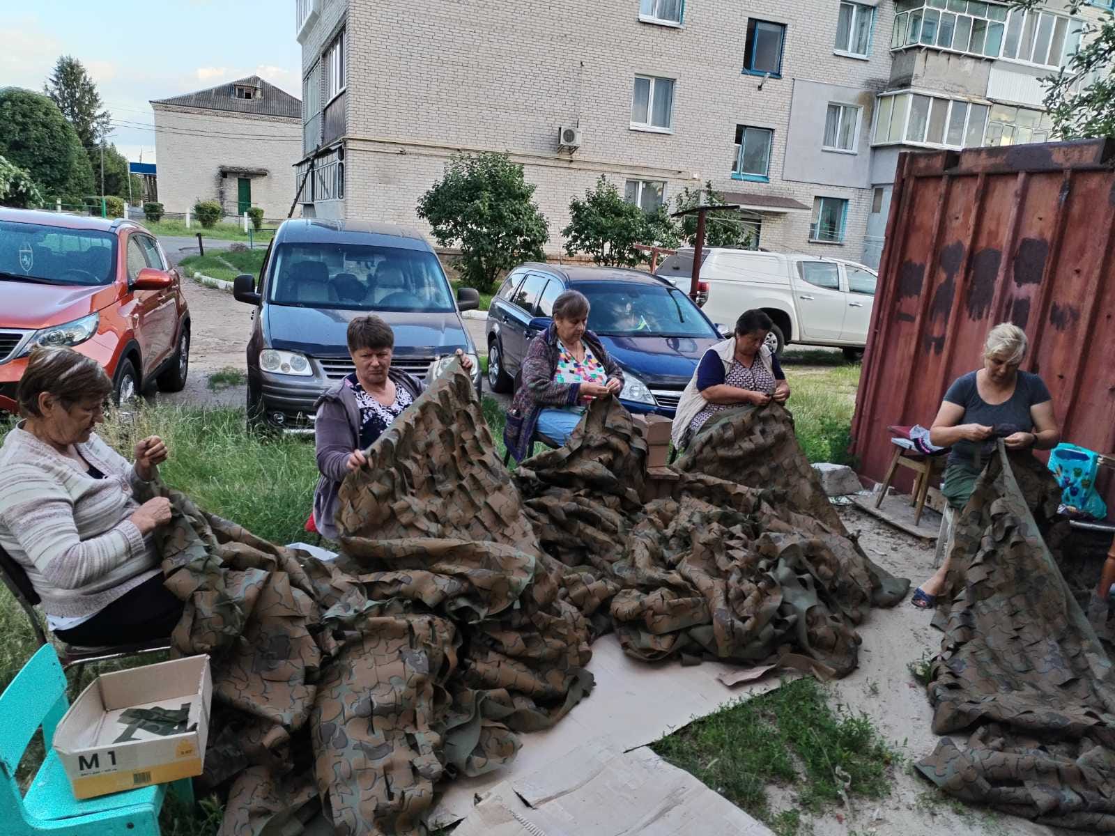 Також руднянські волонтери на постійній основі виготовляють маскувальні сітки для наших захисників. Тільки днями 300 м² спандбонду було «трансформовано» у дванадцять сіток.