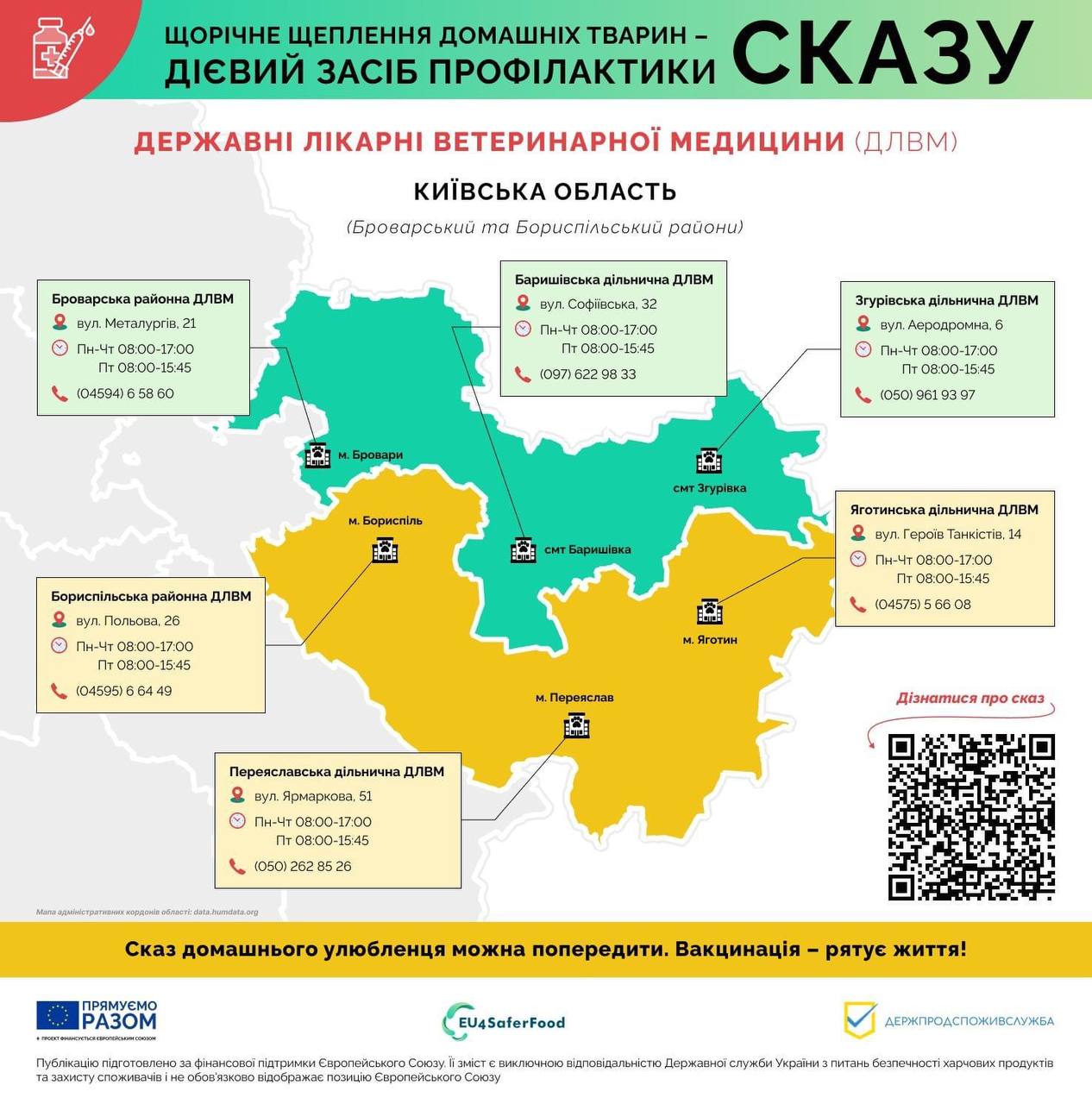 Наголошуємо на тому, що для недопущення сказу тварин необхідно щорічно робити щеплення всім домашнім улюбленцям, починаючи з 3-місячного віку. В лікарнях державної ветеринарної медицини Броварського району вакцина проти сказу є безкоштовною.