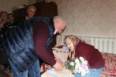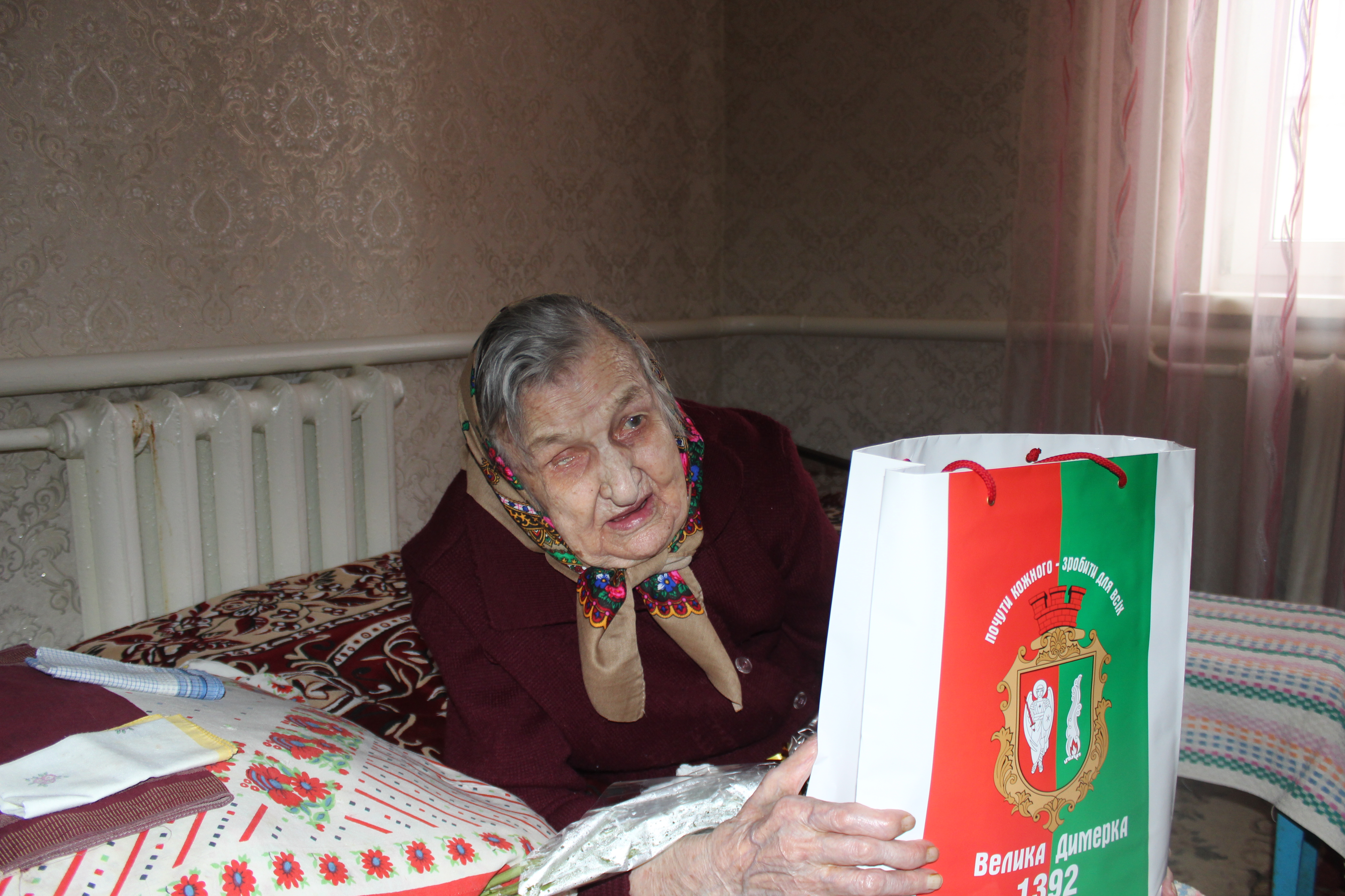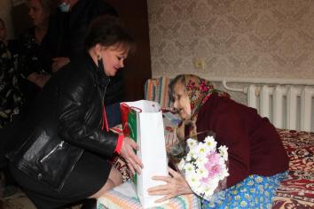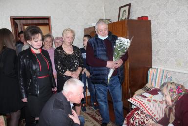 Анатолій Бочкарьов, його заступник Микола Губський та начальник Управління соціального захисту Великодимерської громади Оксана Яковенко, крім щирих вітальних слів, вручили ювілярці квіти та цінні подарунки.