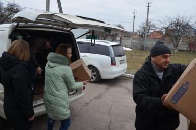 Разом з працівниками Управління соцзахисту представники «Руху вибору» вивантажили з мікроавтобуса близько 40 ящиків, у яких - простині, пелюшки, памперси, туалетний папір.