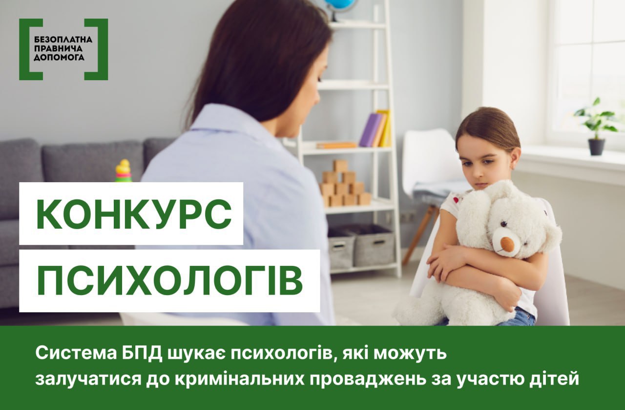 Розпочався конкурс з відбору психологів, які можуть залучатися до кримінальних проваджень за участю дітей через систему БПД: прийом документів до 27 червня. Про це повідомляють в Координаційному центрі з надання правничої допомоги.