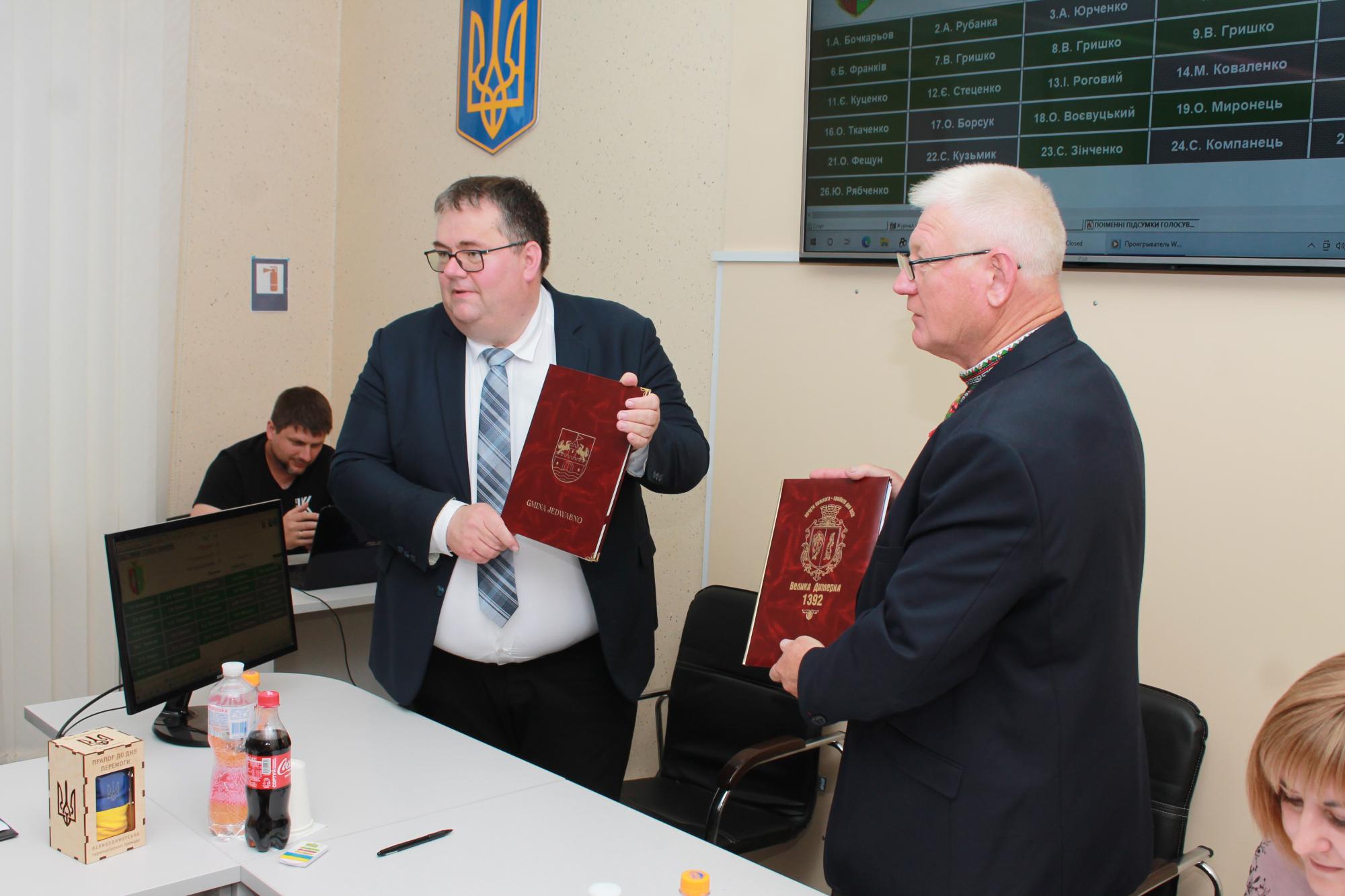 В урочистій атмосфері під час позачергової сесії №ХLIX-VIII 12 червня 2023р. Великодимерська територіальна громада, в особі голови громади Анатолія Бочкарьова, підписала Договір про партнерство та співпрацю з гміною Єдвабно, Щитненський повіт, Вармінсько-Мазурське воєвyдство, Польща, Європейський Союз, в особі голови Гміни Єдвабно Славоміра Амброзяка.