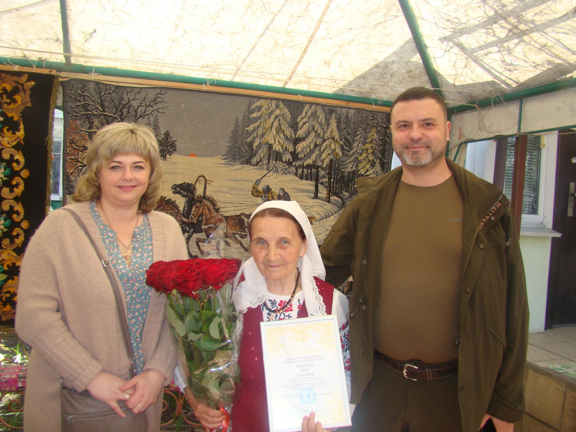 Ніну Федірко, заслужену майстриню, почесного громадянина Броварського району, яка напередодні відзначила своє 85-річчя, із знаменною життєвою датою привітала Броварська районна військова адміністрація (БРВА).