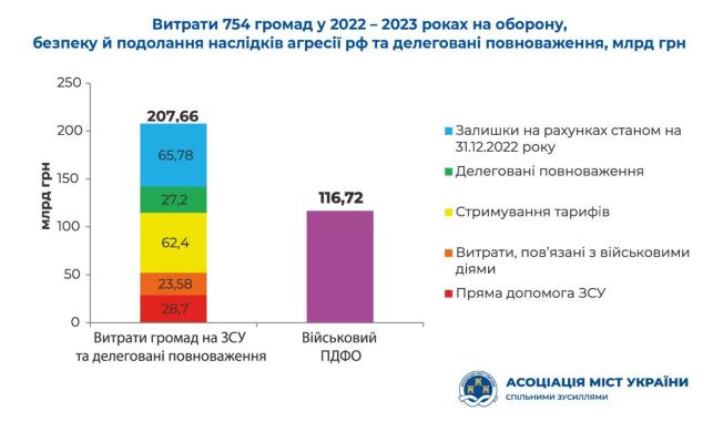 Прямі витрати на безпеку та оборону, витрати через воєнну агресію, оплачені з місцевих бюджетів делеговані повноваження та стримування тарифів, а також залишки коштів на рахунках 754 громад станом на 31.12.2022 року становлять разом уже сьогодні 207,66 млрд грн. Хоча військового ПДФО за два роки заплановано 116,72 млрд грн.