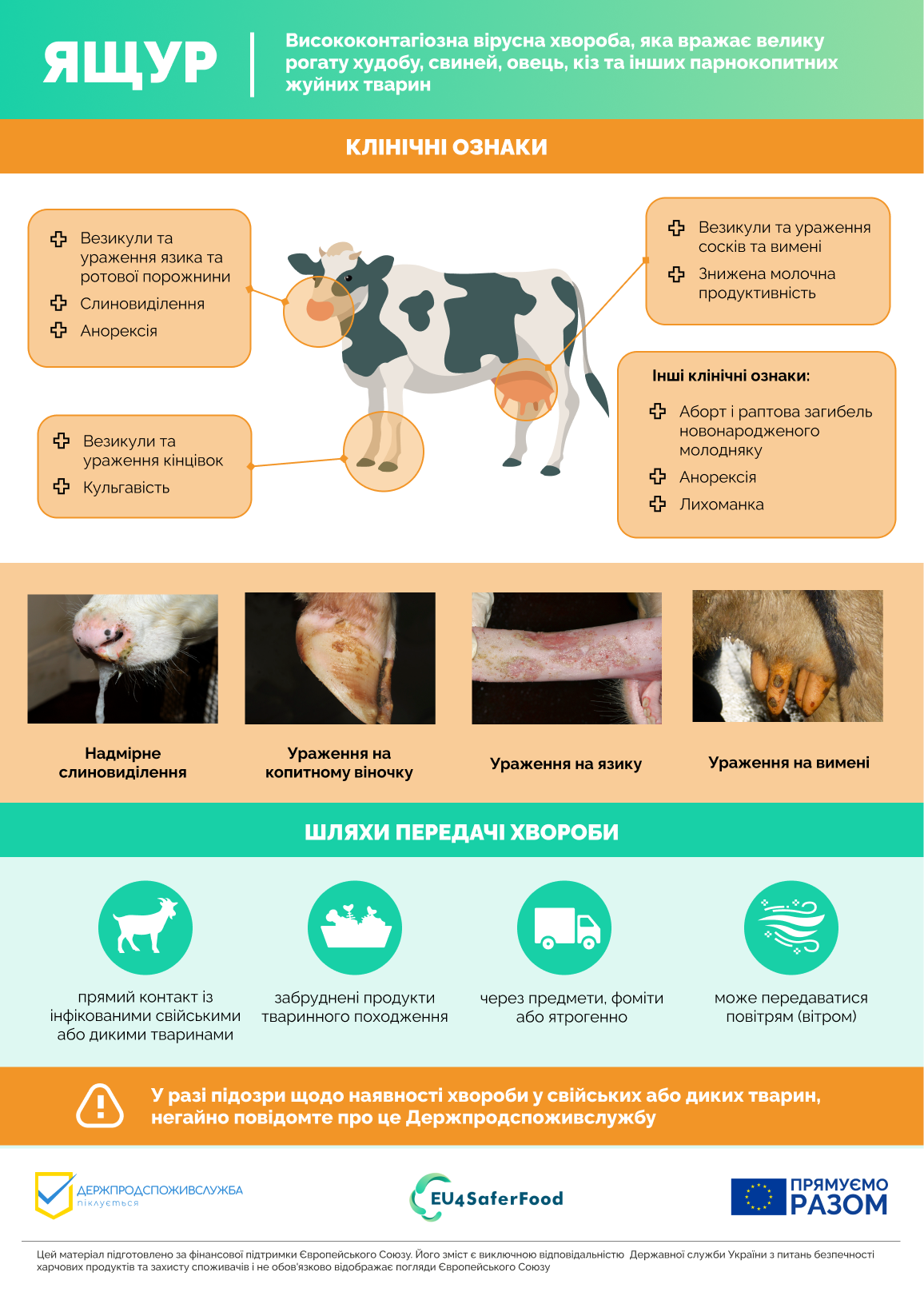 У спільній з європейським проєктом EU4SaferFood інфографіці наочно зображені всі можливі шляхи зараження ящуром.