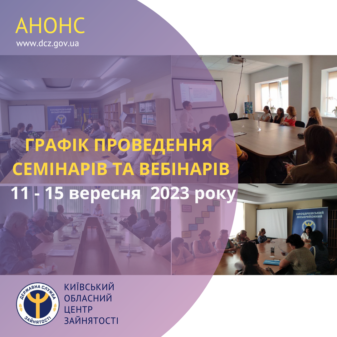 Розклад проведення інформаційних семінарів, тренінгів, вебінарів Київської обласної служби зайнятості на 11-15 вересня 2023 року за посиланням: https://kir.dcz.gov.ua/anonspodiya/informaciyni-seminary-treningy-vebinary-kyyivskoyi-oblasnoyi-sluzhby-zaynyatosti-na-11